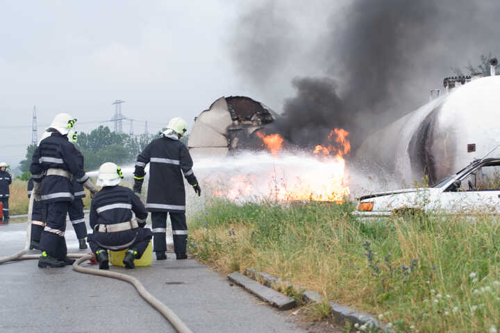 Beschreibung:Das Bild zeigt Feuerwehrleute in Schutzkleidung, die ein Feuer löschen.