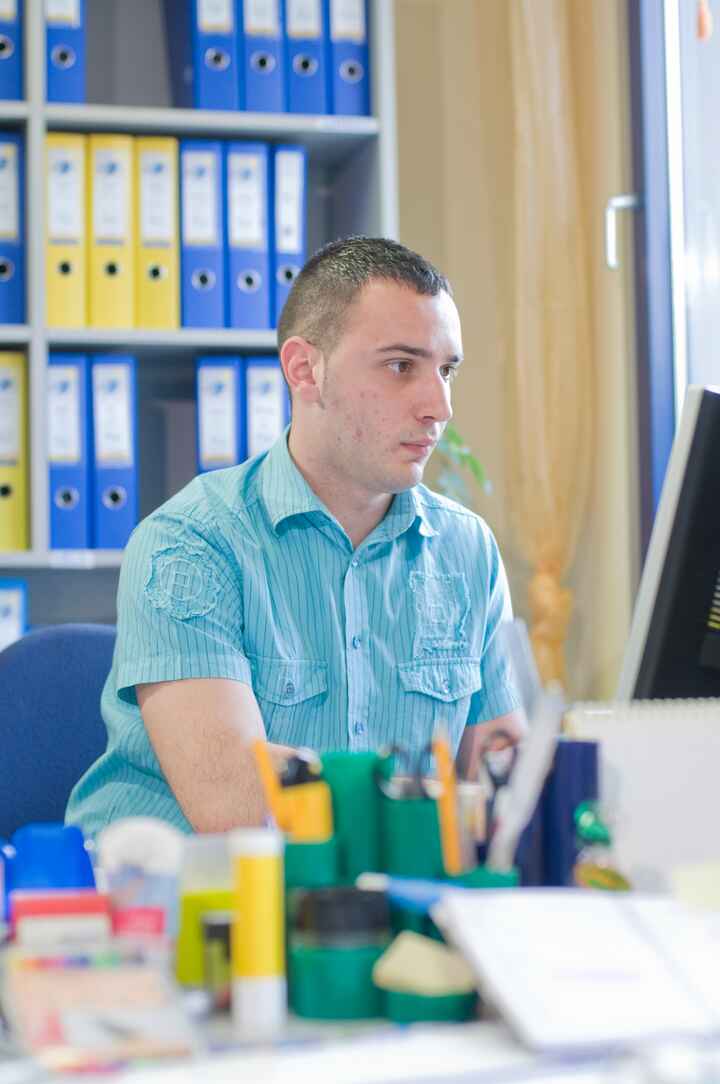 Beschreibung:Auf dem Bild ist ein Betriebsdienstleister an einem Schreibtisch zu sehen.