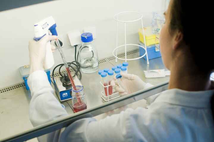 Beschreibung:Auf dem Bild ist eine Biotechnologin in einem Labor zu sehen, die mit einer Pipette Flüssigkeiten in Reagenzgläser füllt.