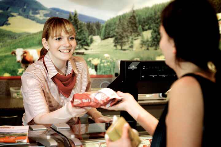 Beschreibung:Das Bild zeigt eine Fleischverarbeiterin hinter einer Fleischtheke, die einer Kundin ein Produkt überreicht.