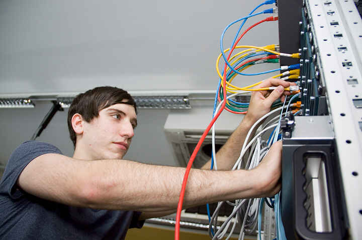 Beschreibung:Auf dem Bild ist ein Informatiker zu sehen, der an einem Server arbeitet, umgeben von Netzwerkgeräten und Kabeln.