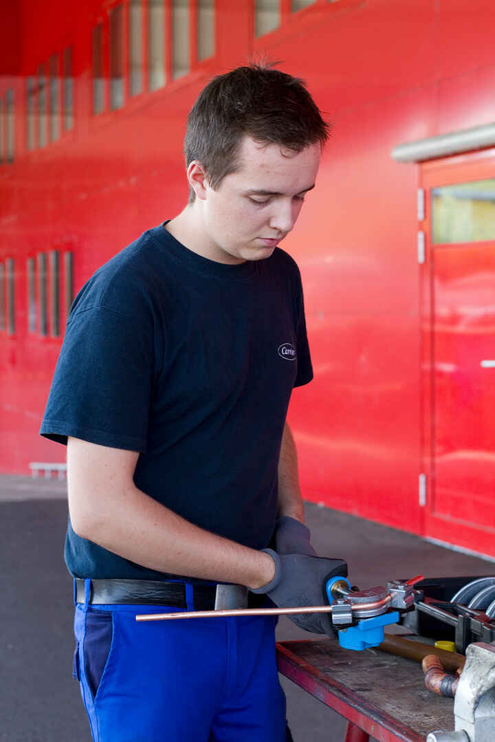 Beschreibung:Auf dem Bild ist eine Person zu sehen, die an einer Werkbank mit Werkzeugen arbeitet, was auf handwerkliche Tätigkeiten im Bereich der Kälte- und Klimatechnik hindeutet.