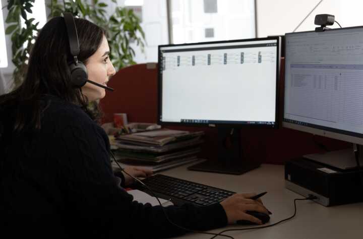 Beschreibung:Auf dem Bild ist eine Person zu sehen, die mit einem Headset an einem Computerarbeitsplatz arbeitet, was auf eine Tätigkeit im Bürobereich hinweist.