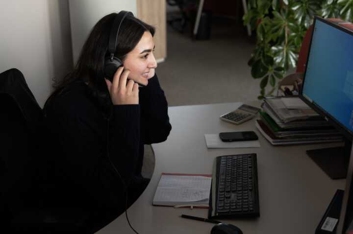Beschreibung:Auf dem Bild ist eine Person zu sehen, die an einem Schreibtisch sitzt, ein Headset trägt und auf einen Computerbildschirm schaut, was auf eine Tätigkeit im Büro oder Kundenservice hinweisen könnte.