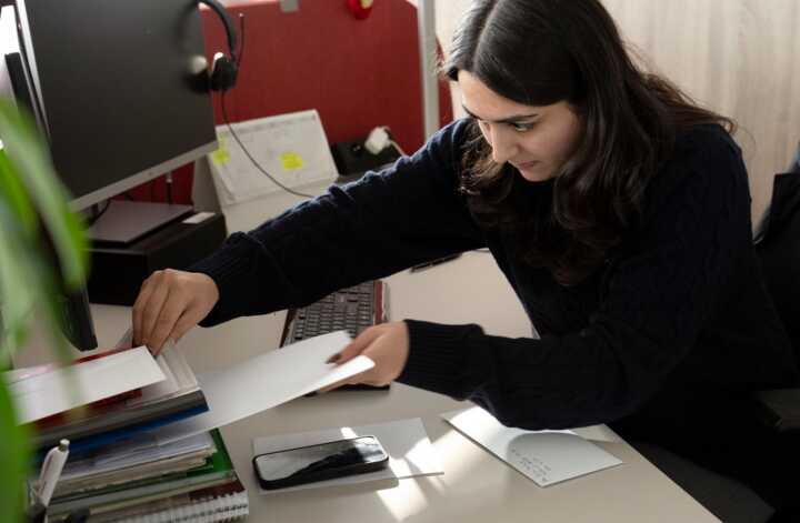 Beschreibung:Die Person auf dem Bild sortiert Unterlagen an einem Schreibtisch, was typisch für administrative Berufe wie Bürokaufmann/-frau oder SachbearbeiterIn ist.