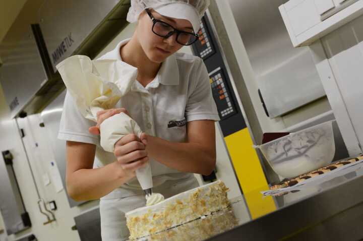 Beschreibung:Eine Person dekoriert eine Torte in einer Konditorei oder Bäckerei.