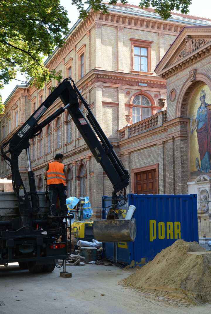 Beschreibung:Ein Kran- und Baumaschinenführer bedient einen LKW-Kran auf einer Baustelle vor einem historischen Gebäude.
