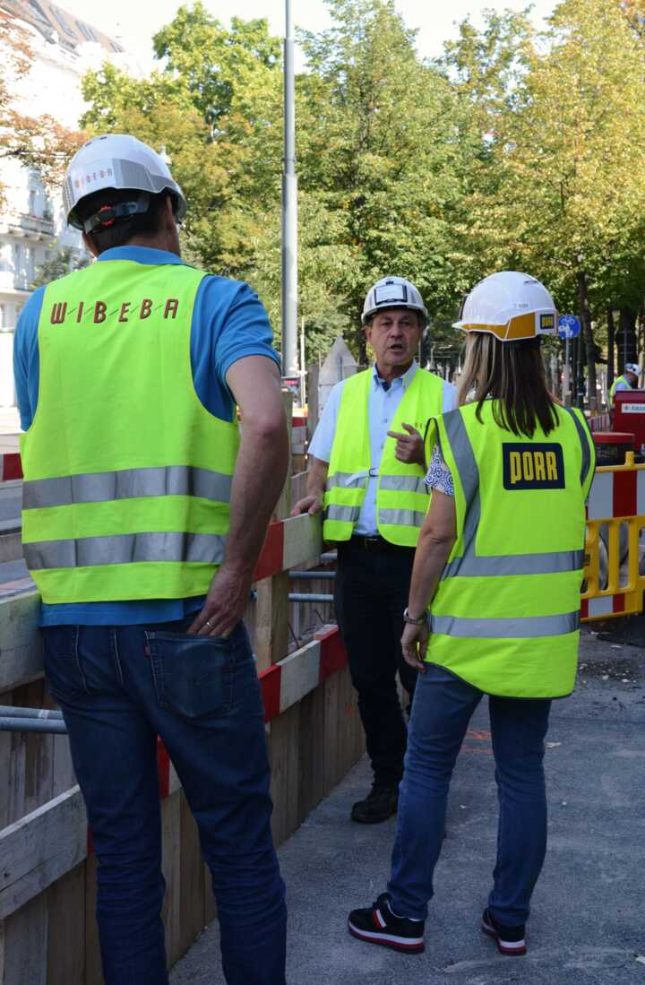 Beschreibung:Auf dem Bild sind Kran- und BaumaschinenführerInnen zu sehen, die auf einer Baustelle stehen und Schutzhelme sowie Warnwesten tragen.
