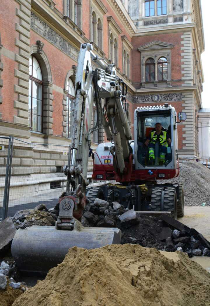 Beschreibung:Auf dem Bild ist ein Kran- und Baumaschinenführer zu sehen, der einen Bagger bedient, um Erdarbeiten vor einem historischen Gebäude durchzuführen.
