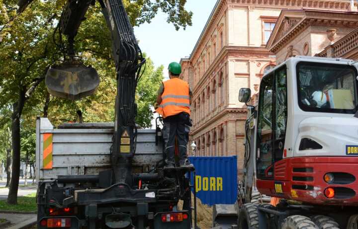 Beschreibung:Das Bild zeigt Kran- und Baumaschinenführer, die mit einem Bagger und einem Lastwagen an einer Baustelle arbeiten.