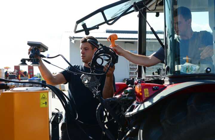 Beschreibung:Auf dem Bild sind zwei Personen zu sehen, die an einem Traktor arbeiten und technische Geräte installieren oder warten.