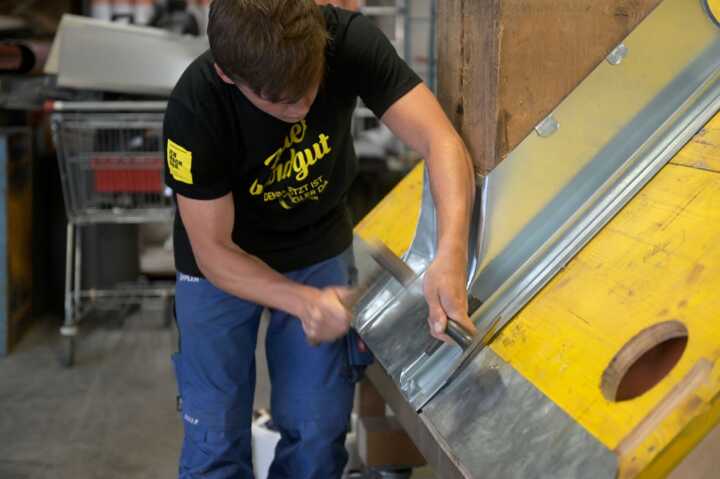 Beschreibung:Auf dem Bild ist zu sehen, wie eine Person ein Blech bearbeitet, was typisch für den Beruf des/der BauspenglerIn ist.