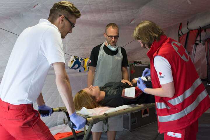 Beschreibung:SanitäterInnen versorgen eine Person auf einer Trage in einem medizinischen Notfallzelt.