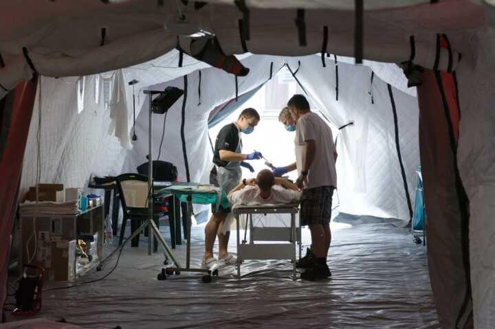 Beschreibung:Das Bild zeigt SanitäterInnen, die in einem provisorischen Zelt eine Behandlung durchführen.