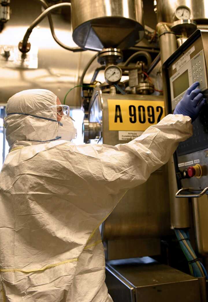 Beschreibung:Eine Chemieverfahrenstechnikerin in Schutzkleidung bedient ein Kontrollpanel in einem Laborumfeld.