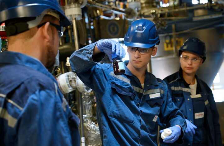 Beschreibung:Auf dem Bild sind ChemieverfahrenstechnikerInnen in Schutzkleidung in einer chemischen Anlage zu sehen, die eine Flüssigkeitsprobe untersuchen.