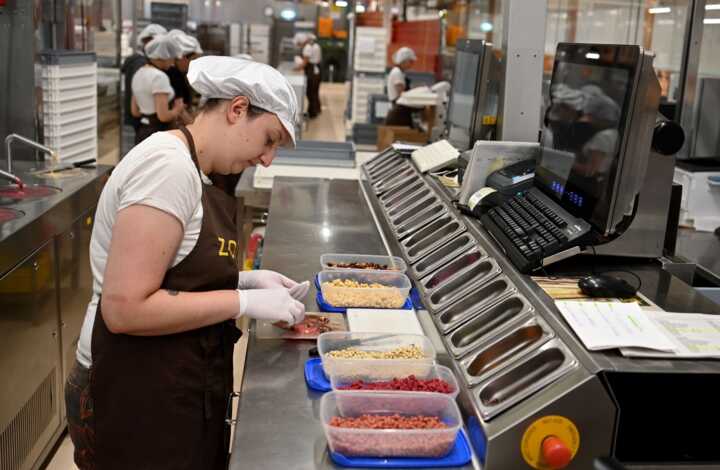 Beschreibung:Auf dem Bild ist eine Chocolatières, die in einer Schokoladenmanufaktur Zutaten für die Herstellung von Schokoladen vorbereitet.