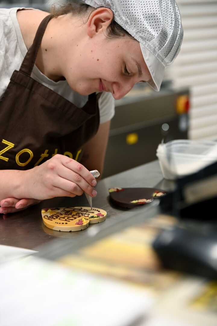 Beschreibung:Eine Chocolatières dekoriert Schokolade in einer Chocolaterie.