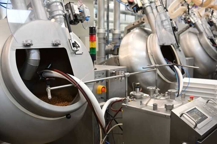 Beschreibung:Das Bild zeigt industrielle Maschinen, die in der Schokoladenverarbeitung verwendet werden.