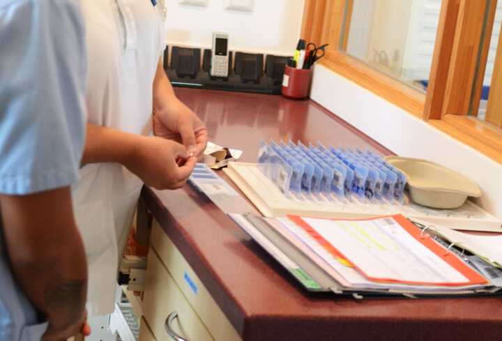 Beschreibung:Das Bild zeigt zwei diplomierte Gesundheits- und KrankenpflegerInnen in medizinischer Kleidung, die mit Medikamenten und Dokumenten arbeiten.