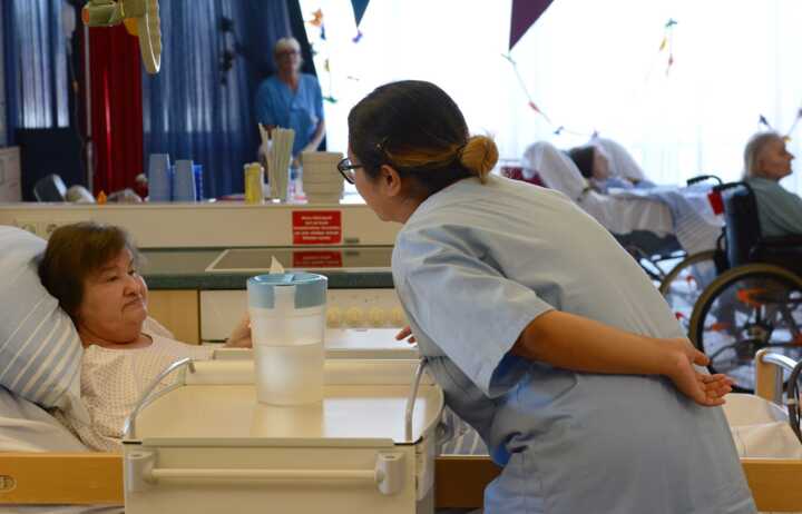 Beschreibung:Eine diplomierte Gesundheits- und Krankenpflegerin in der Geriatrie kümmert sich um eine Patientin in einem Krankenhauszimmer.