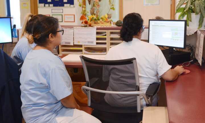 Beschreibung:Auf dem Bild sind diplomierte Gesundheits- und Krankenpflegerinnen vor einem Computer zu sehen.
