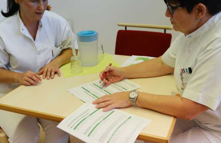 Beschreibung:Zwei diplomierte Gesundheits- und Krankenpflegerinnen in Berufskleidung besprechen und bearbeiten Dokumente.