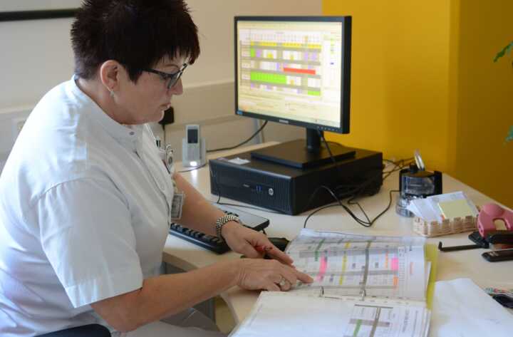 Beschreibung:Eine diplomierte Gesundheits- und Krankenpflegerin arbeitet mit einem Computer und überprüft Dokumente.