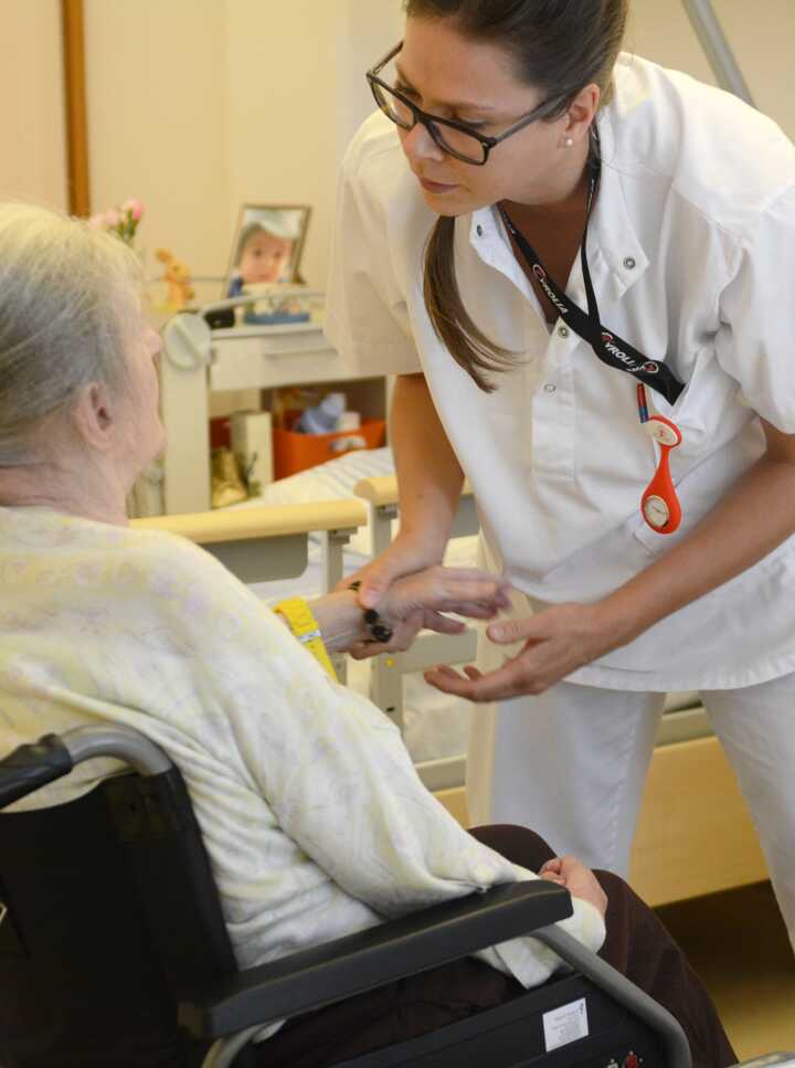 Beschreibung:Die Szene zeigt eine Pflegeassistentin, die sich um eine ältere Person in einem Rollstuhl kümmert.