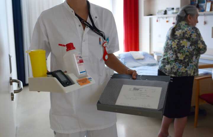 Beschreibung:Auf dem Bild ist eine Pflegeassistentin zu sehen, die medizinische Utensilien und Dokumente trägt.
