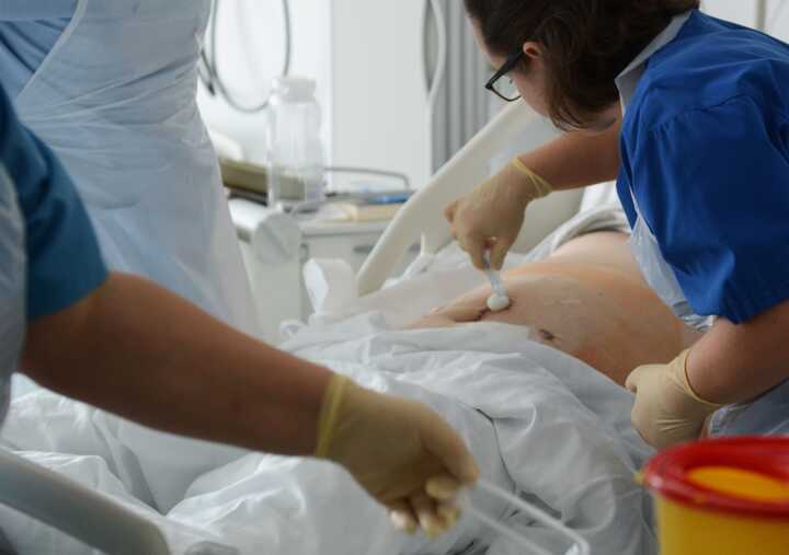 Beschreibung:Auf dem Bild sind diplomierte Gesundheits- und Krankenpflegerinnen zu sehen, die sich um die Behandlung eines Patienten kümmern.