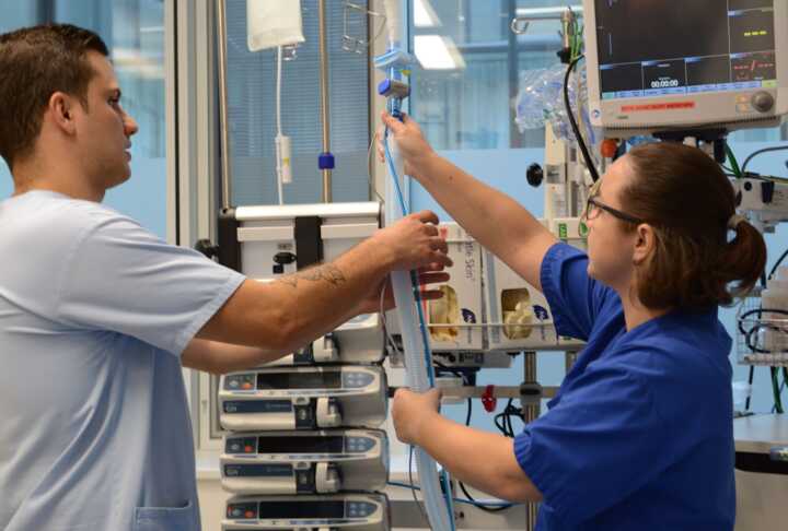 Beschreibung:Auf dem Bild sind zwei diplomierte Gesundheits- und KrankenpflegerInnen zu sehen, die an medizinischen Geräten arbeiten.