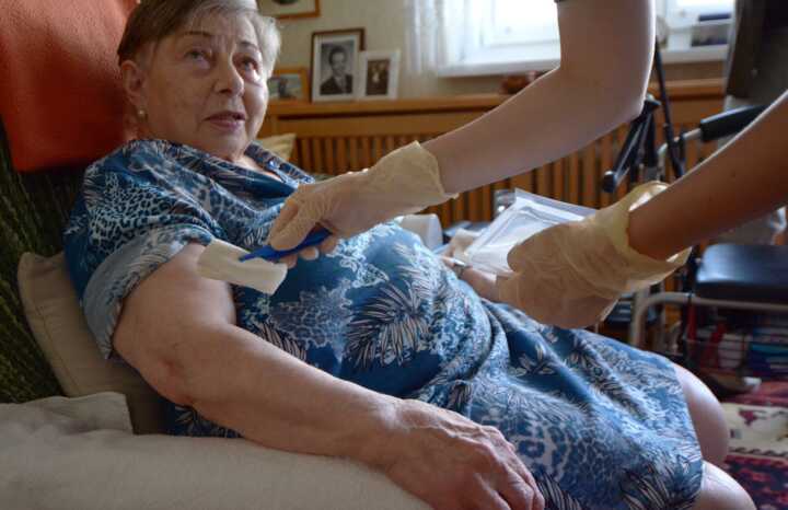 Beschreibung:Auf dem Bild wird eine ältere Frau von einer diplomierten Gesundheits- und Krankenpflegerin versorgt.