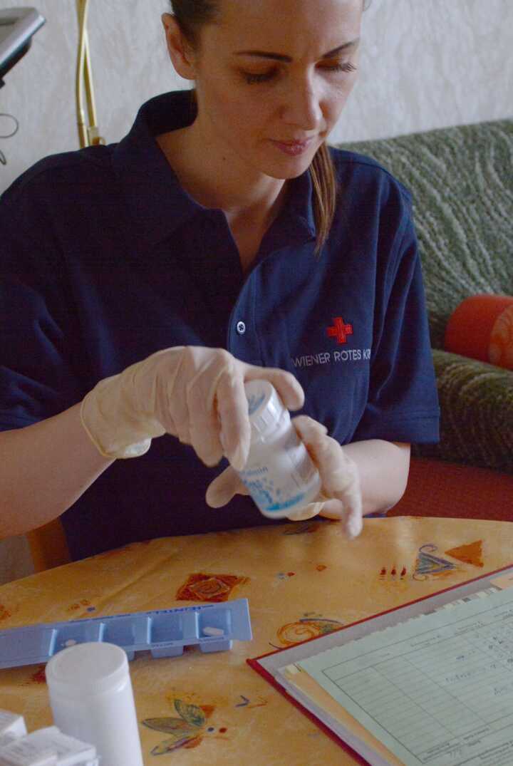 Beschreibung:Eine diplomierte Gesundheits- und Krankenpflegerin ist in der Hauspflege tätig und bereitet Medikamente vor.