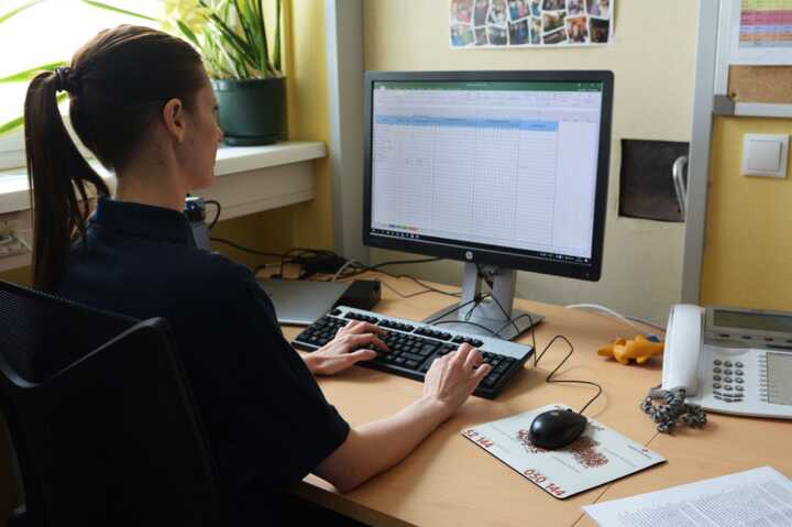 Beschreibung:Eine diplomierte Gesundheits- und Krankenpflegerin arbeitet am Computer und gibt Daten in eine Tabelle ein.