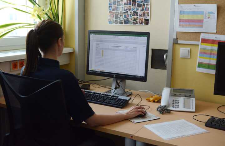 Beschreibung:Eine diplomierte Gesundheits- und Krankenpflegerin dokumentiert PatienInnendaten in einer Tabelle.