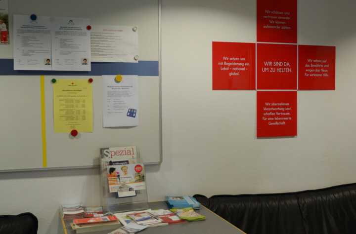 Beschreibung:Das Bild zeigt das Büro des Roten Kreuzes mit Informationsmaterial und Anschlagtafel.