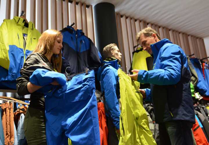 Beschreibung:Das Bild zeigt eine Sportartikelverkäuferin, die in einem Geschäft einen Kunden bezüglich Skibekleidung berät.