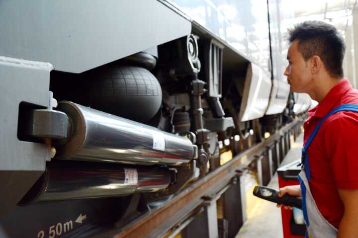 Beschreibung:Ein Elektrotechniker überprüft die Mechanik und Komponenten eines Zuges in einer Wartungshalle.