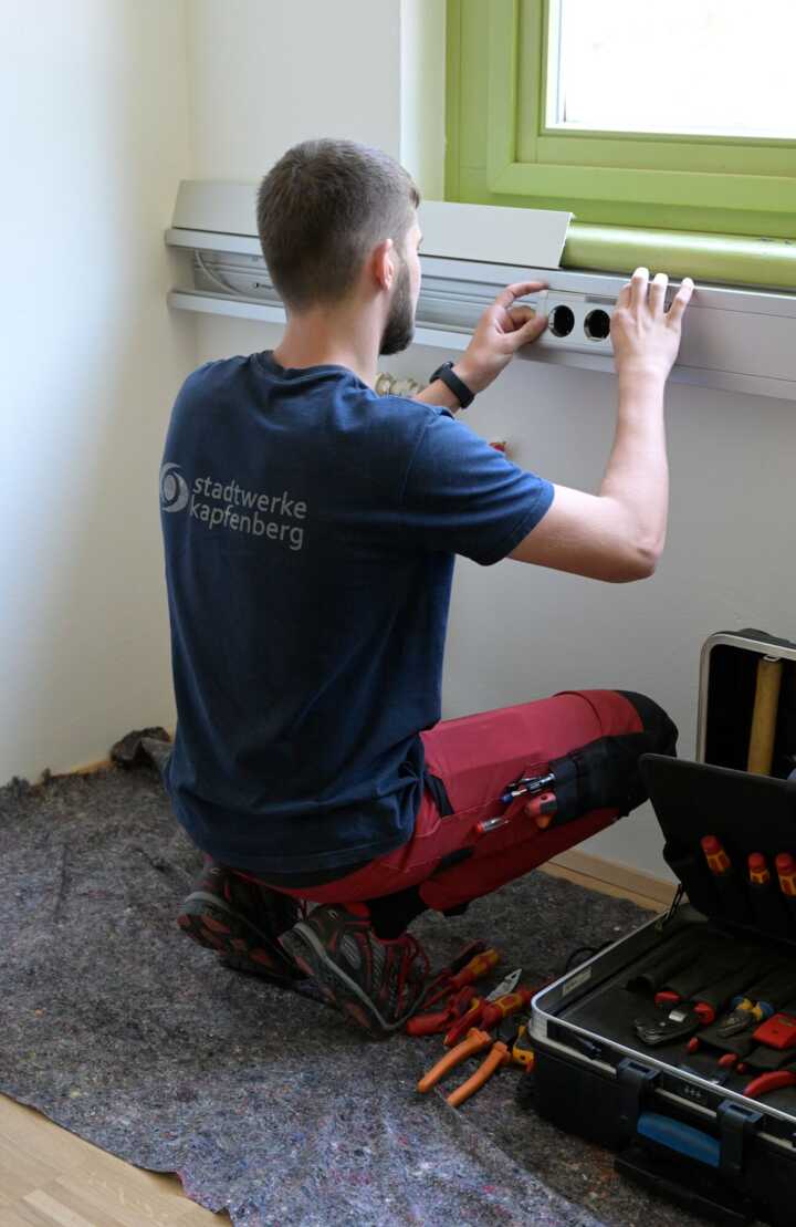 Beschreibung:Ein Elektroenergietechniker arbeitet an einer Installation.