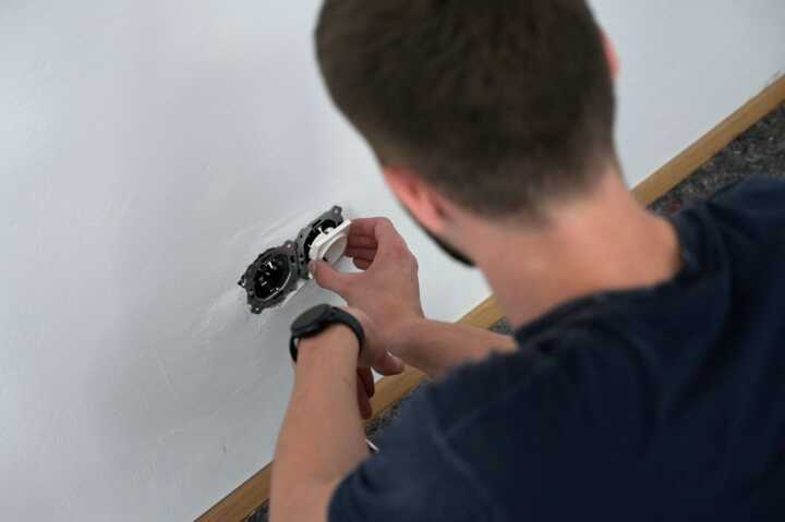 Beschreibung:Ein Elektroenergietechniker installiert eine Steckdose in einer Wand.