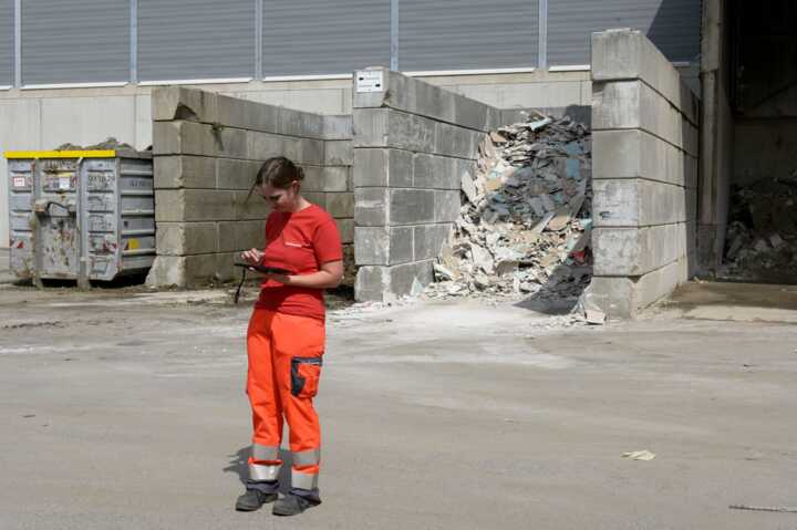 Beschreibung:Eine Entsorgungs- und Recyclingtechnikerin in Arbeitskleidung steht auf einem Recyclinghof und benutzt ein elektronisches Gerät.