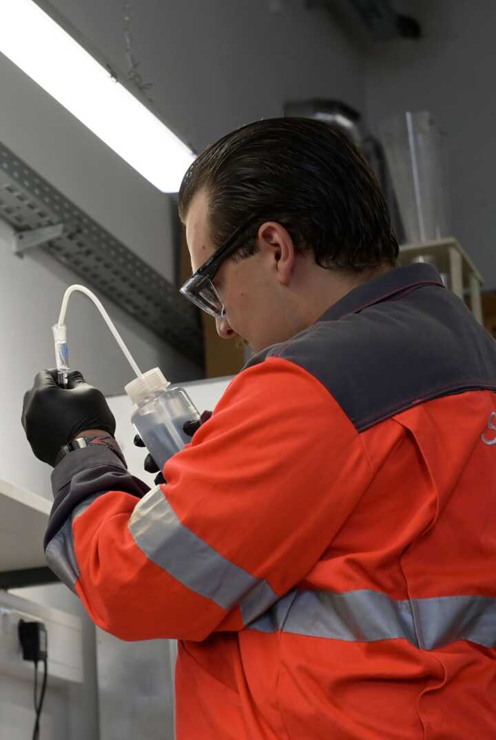 Beschreibung:Ein Entsorgungs- und Recyclingtechniker in Arbeitskleidung führt eine Flüssigkeitsanalyse im Labor durch.