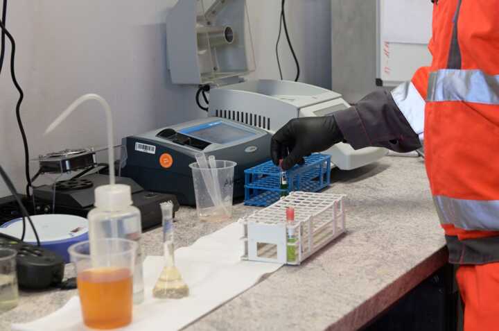Beschreibung:Auf dem Bild ist ein Entsorgungs- und Recyclingtechniker zu sehen, der in einem Labor chemische Proben analysiert.