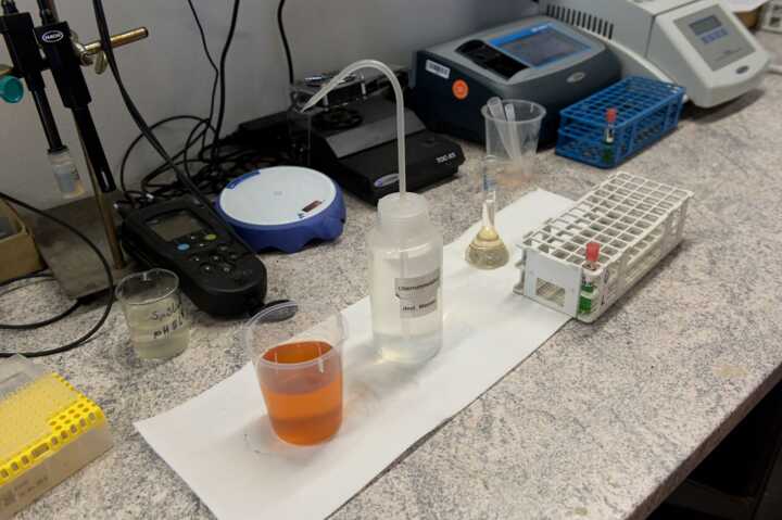 Beschreibung:Das Bild zeigt eine Laboreinrichtung mit verschiedenen Geräten und Chemikalien, die in der Entsorgungs- und Recyclingstechnik verwendet werden.