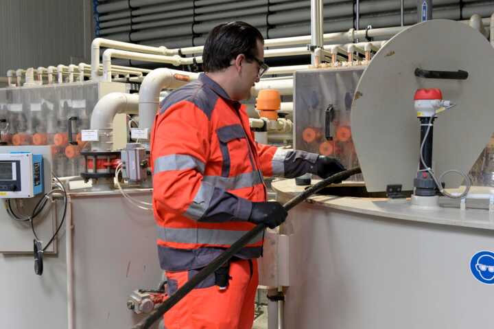 Beschreibung:Ein Entsorgungs- und Recyclingtechniker in Schutzkleidung arbeitet an einer industriellen Anlage mit Rohren und Tanks.