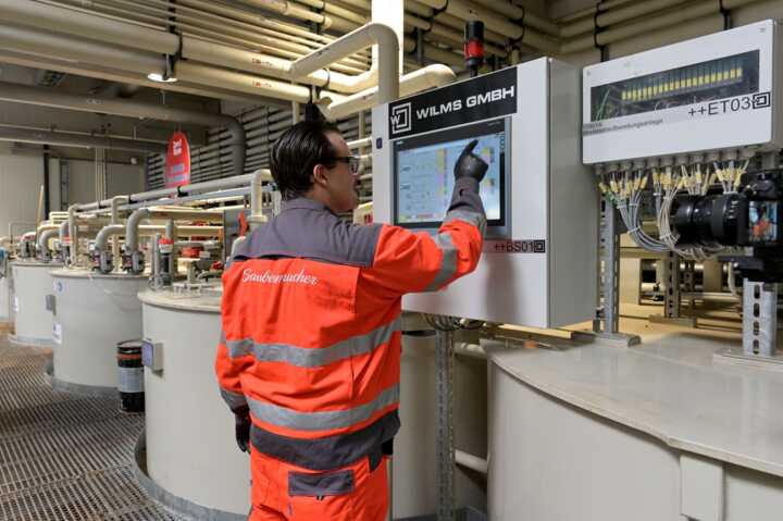 Beschreibung:Ein Entsorgungs- und Recyclingtechniker in Arbeitskleidung bedient ein Kontrollpanel in einer industriellen Anlage.