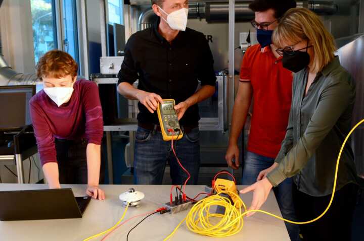 Beschreibung:Mehrere ElektrotechnikerInnen führen mit technischen Geräten und einem Laptop Messungen durch.