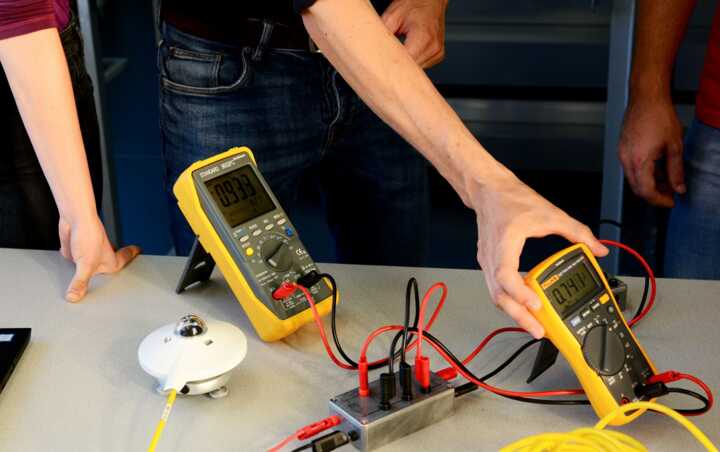 Beschreibung:Auf dem Bild sind ElektroenergietechnikerInnen zu sehen, die mit Multimetern elektrische Messungen durchführen.