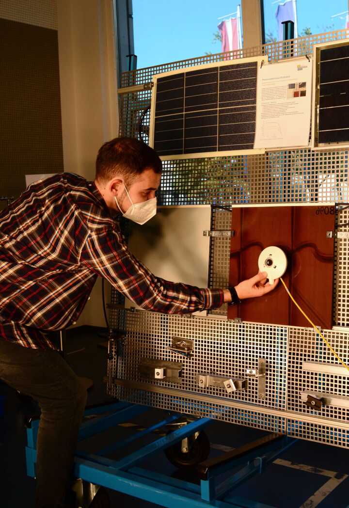 Beschreibung:Ein Elektroenergietechniker führt eine technische Arbeit an einer Solarenergie-Trainingsstation durch.